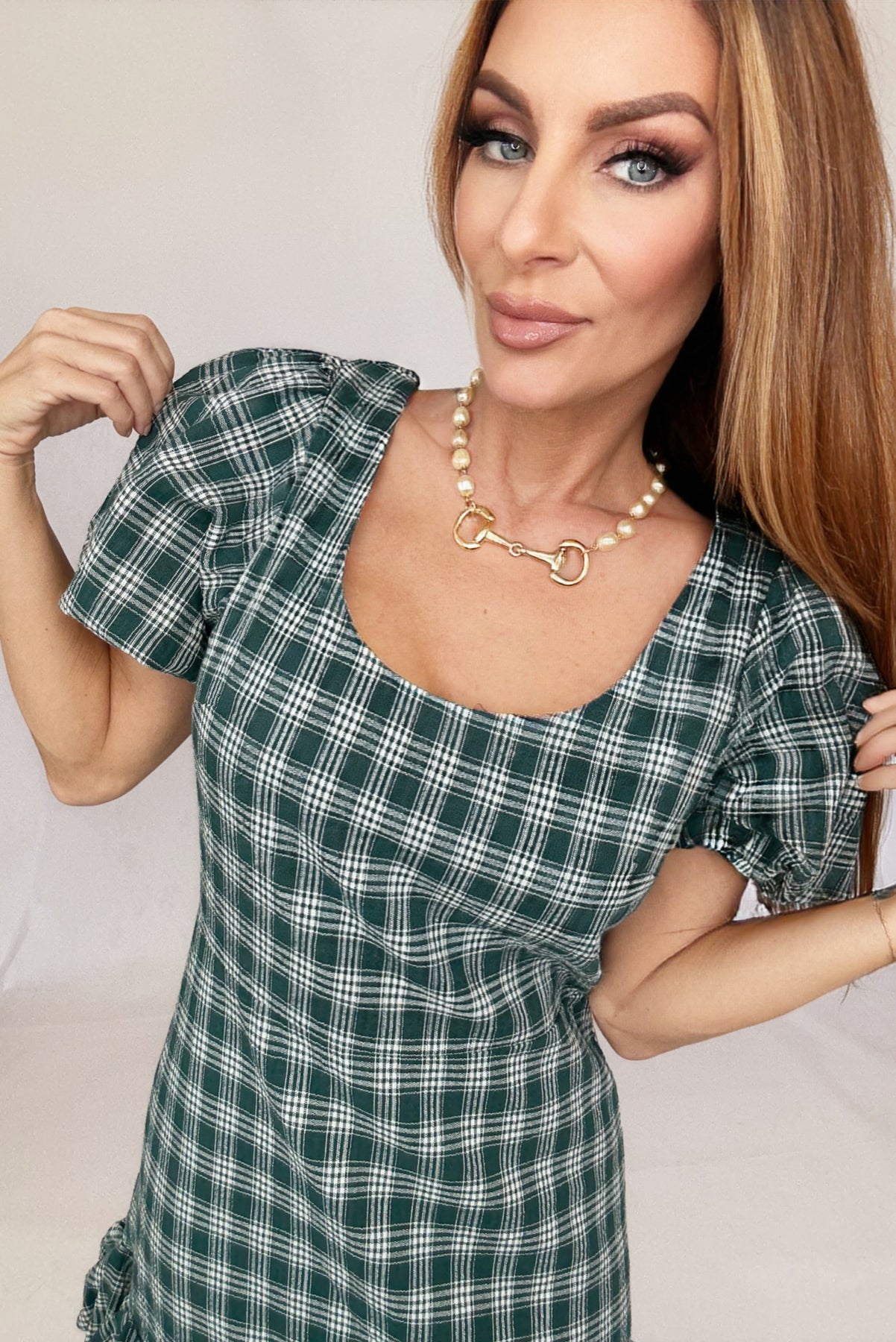 Embrace festive elegance in the Hunter’s Holiday Dress. This hunter green mini dress features a flattering A-line silhouette with playful puff short sleeves and delicate ruffle details. The open back adds a hint of allure, making it perfect for holiday gatherings or special occasions. Comfortable yet stylish, it combines classic plaid charm with modern design to ensure you stand out with effortless grace.