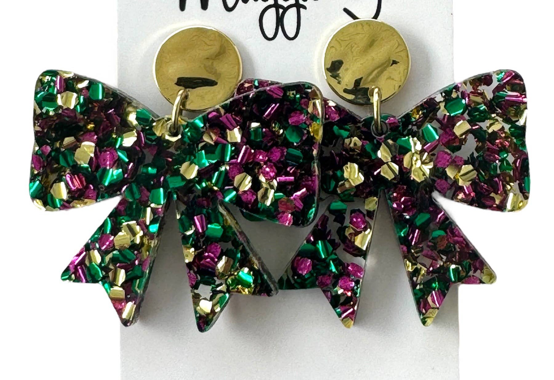 Celebrate the spirit of Mardi Gras with these show-stopping bow earrings that capture all the festive glamour of the season. Crafted with chunky glitter in bold purple, green, and gold—the iconic colors of the carnival—these coquette-inspired bows make a statement whether you're hitting the parade route or bringing that jubilant energy to everyday wear. The sparkling finish catches the light beautifully, ensuring you'll turn heads at any celebration. Perfect for Mardi Gras enthusiasts and anyone who loves bold, playful accessories. order yours today and get ready to shine.