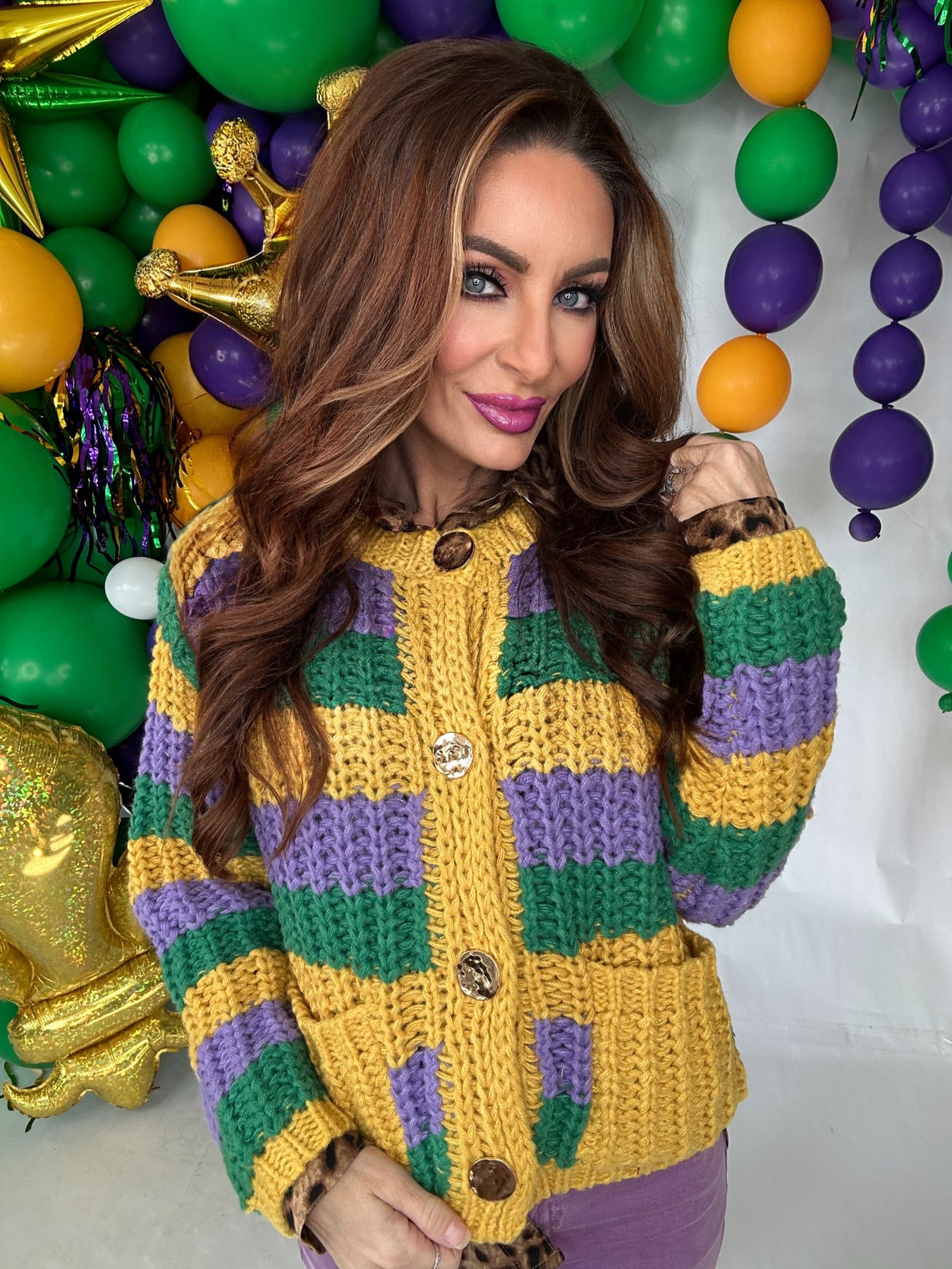 Celebrate the spirit of New Orleans with this vibrant Mardi Gras cardigan, perfect for throwing back to the festive energy of Uptown. Designed with bold, eye-catching colors and playful details, this sweater captures the essence of krewe season. Layer it over your favorite outfit for an instant dose of carnival magic, or wear it solo as a statement piece. Whether you're catching beads on Bourbon Street or channeling that iconic "throw me something mister" energy year-round, this funky top brings the party wherever you go. Limited availability—secure yours before this festive favorite sells out.
