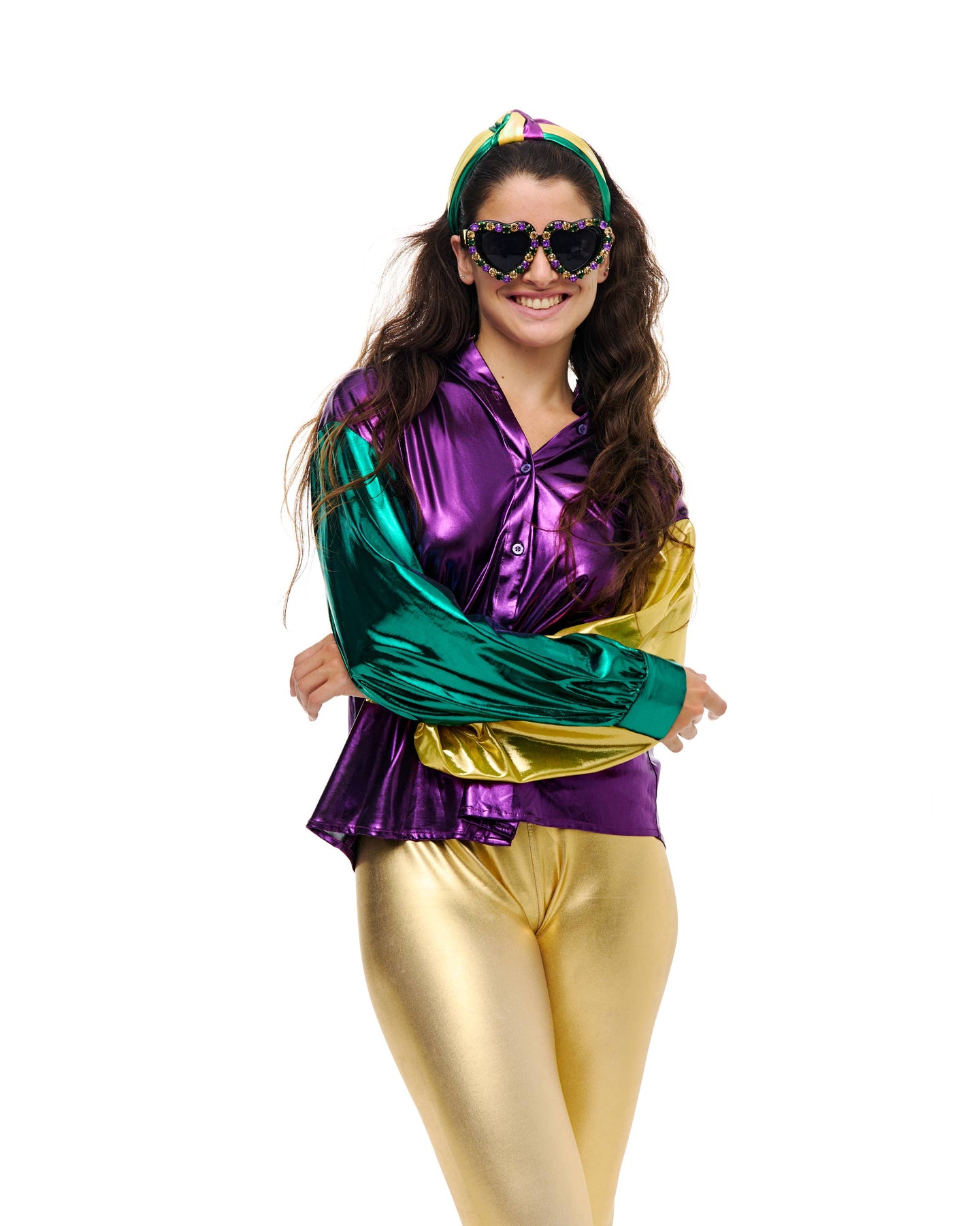 Celebrate in style with this eye-catching Mardi Gras Metallic Button Down Shirt. Featuring shimmering metallic accents that catch the light with every move, this statement piece brings festive flair to any occasion. The classic button-down silhouette offers versatility—dress it up for parties or wear it casually for everyday glamour. Perfect for Mardi Gras festivities, themed events, or anyone who loves adding a touch of sparkle to their wardrobe. Make a bold impression and stand out from the crowd.