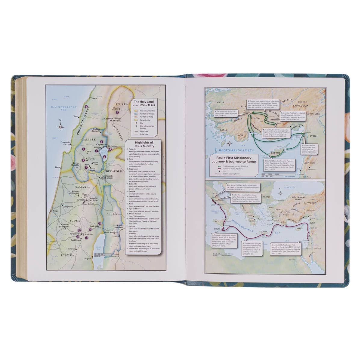 Express your faith creatively when you apply artistic journaling to the Teal Floral Ally Collection Large Print Faux Leather King James Version Note-taking Bible.  With its large print and wide margins, this Bible is perfect for the right-brained woman who learns through color, drawing, doodling, painting, or lettering alongside the text. White, cream, pink and orange floral design, Teal faux leather,  Softcover, Heat-debossed gold-foiled title,  Love the Lord thy God with all thy heart and with all thy soul and with all thy mind, Matthew 22:37, Ally collection, Allison Loveall design, King James Version,   Note-taking Bible,   Epistle dedicatory letter included, 2.