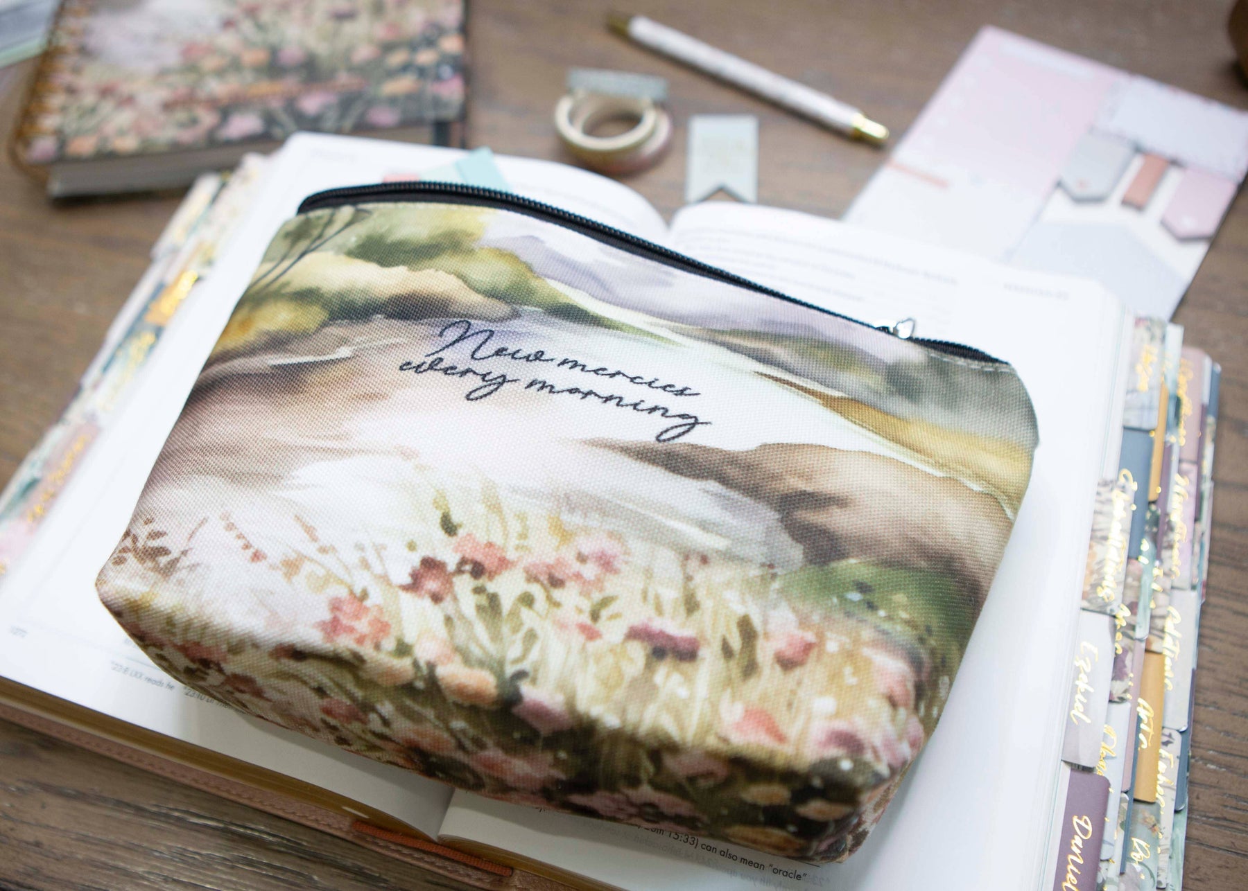 If you're looking for a bible pencil case to organize your pens and highlighters, meet your new Bible study essential—the New Mercies Every Morning Bible pencil pouch!
