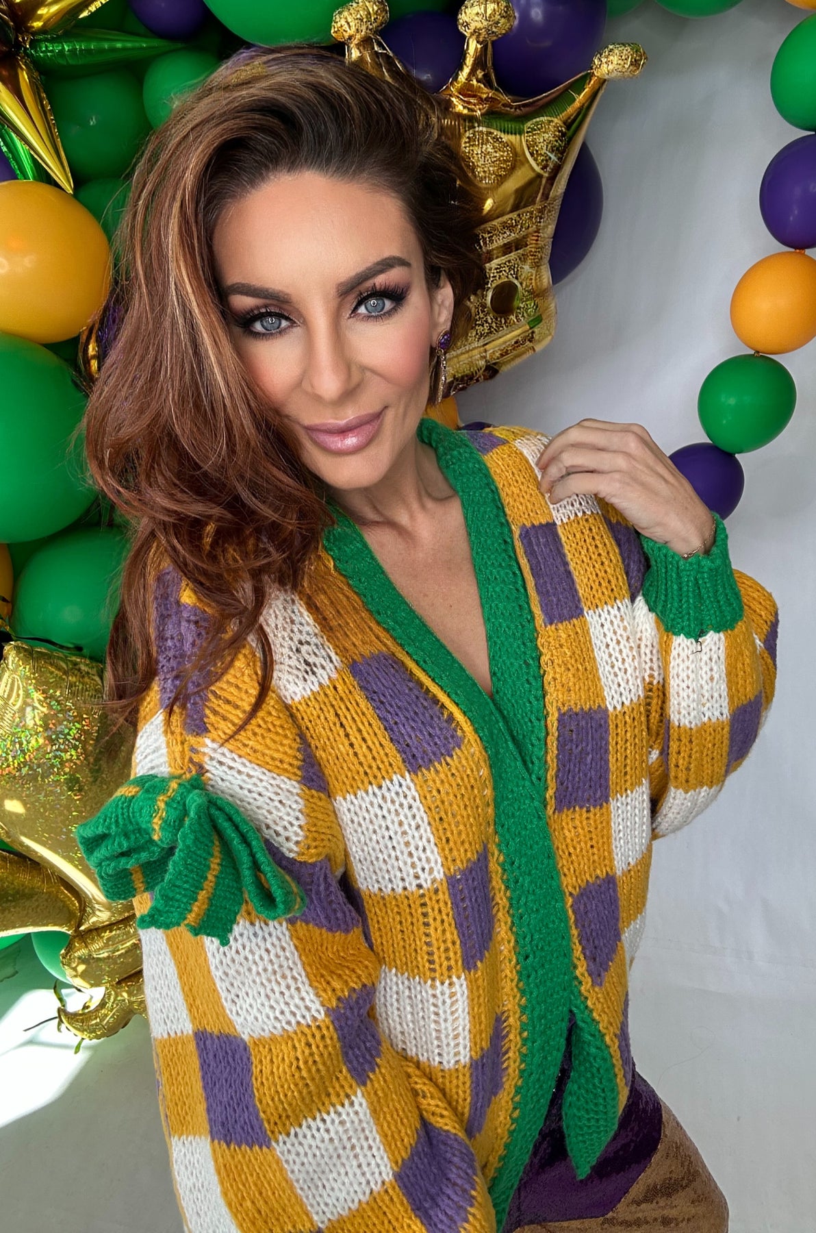 Celebrate the vibrant spirit of Mardi Gras with this eye-catching checker board cardigan. Featuring a bold front-open design in festive color blocking, this piece brings playful energy to any outfit. Perfect for layering during the season or standing alone as a statement piece, the classic checker pattern adds timeless appeal while the relaxed fit ensures all-day comfort. Pre-order now and get ready to turn heads at your next celebration or casual outing.