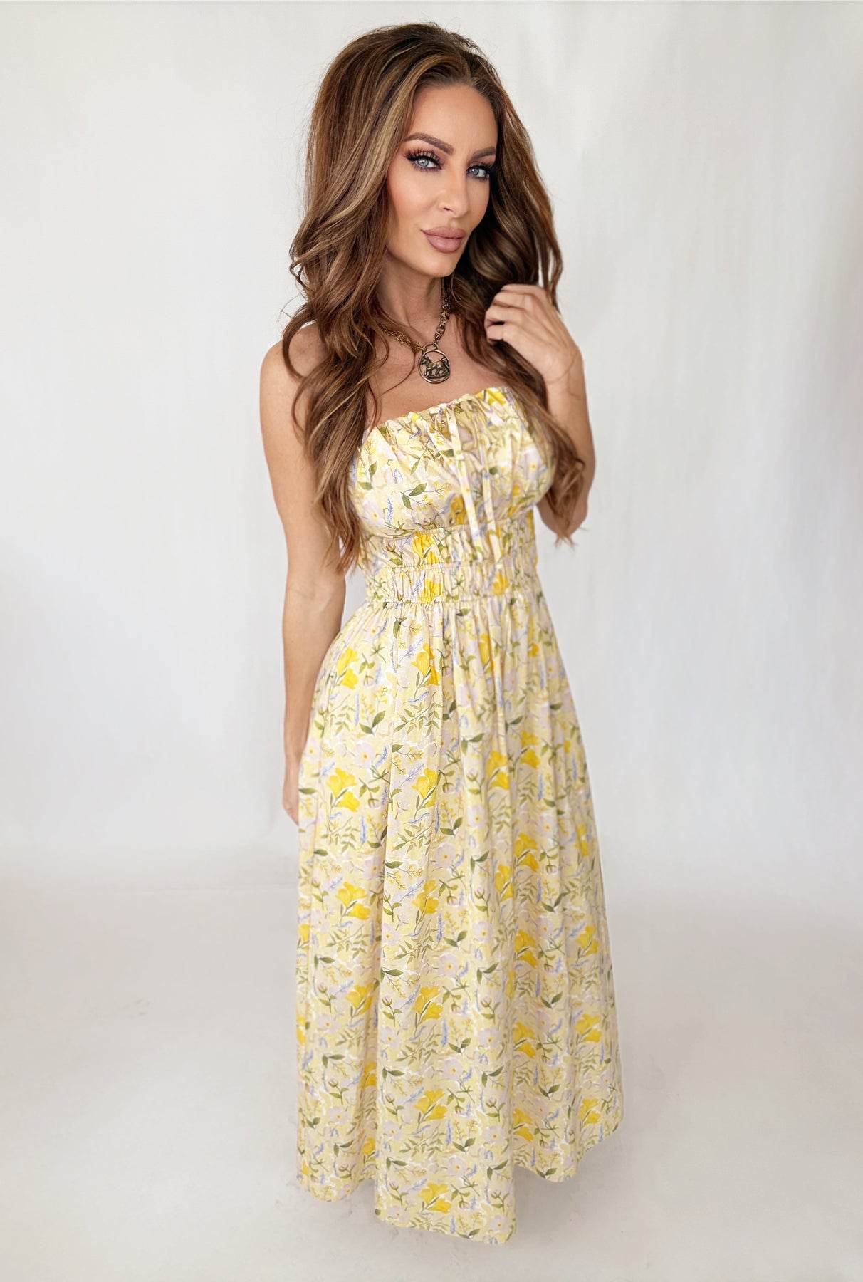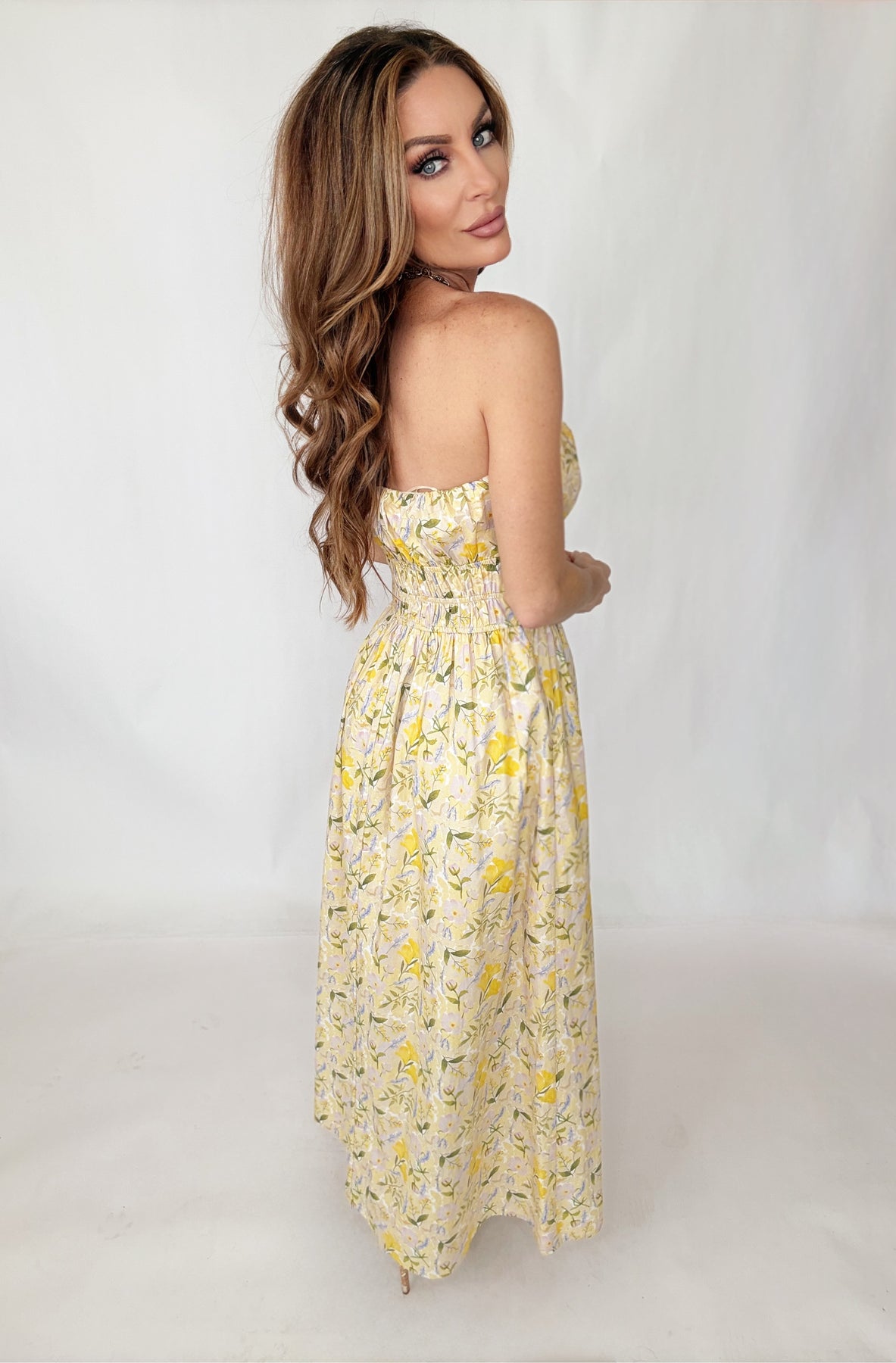 Elevate your warm-weather wardrobe with the Limoncello Luxe Dress, a captivating midi silhouette that marries sophistication with playful charm. Rendered in a vibrant lemon blossom hue with an intricate floral print, this piece captures the essence of effortless spring and summer elegance. The ruched halter neckline creates flattering definition while the midi length offers timeless versatility—dress it up for evening events or down for daytime adventures. Practical hidden pockets add everyday functionality without compromising the refined aesthetic. A true wardrobe essential for those who refuse to choose between style and comfort.