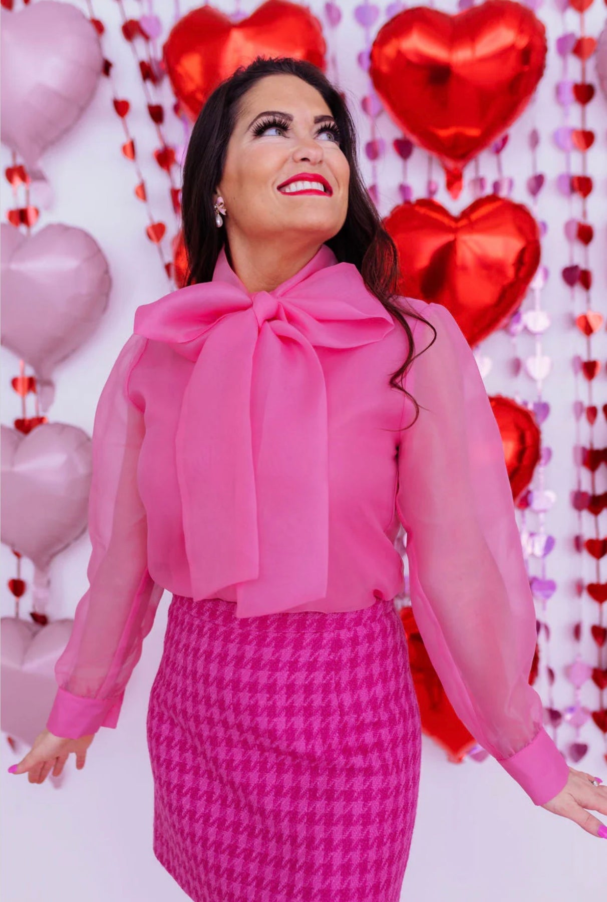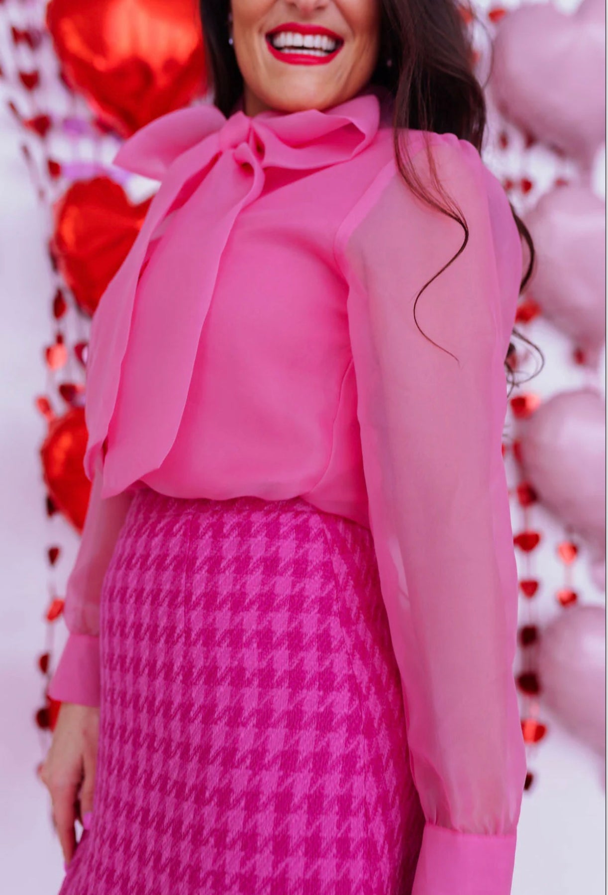 Soft, feminine, and timelessly elegant, this light pink button-down blouse brings effortless luxury to your spring wardrobe. Designed with delicate sheer long sleeves and a romantic tie- neck, it blends classic sophistication with modern charm. The flowy, airy fabric drapes beautifully, while the bow detail adds a polished touch that feels chic and elevated. Perfect for brunches, events, or dressed-up everyday style, this blouse pairs seamlessly with tailored trousers, denim, or your favorite Bloom West statement pieces. A refined, classy staple you’ll reach for season after season.