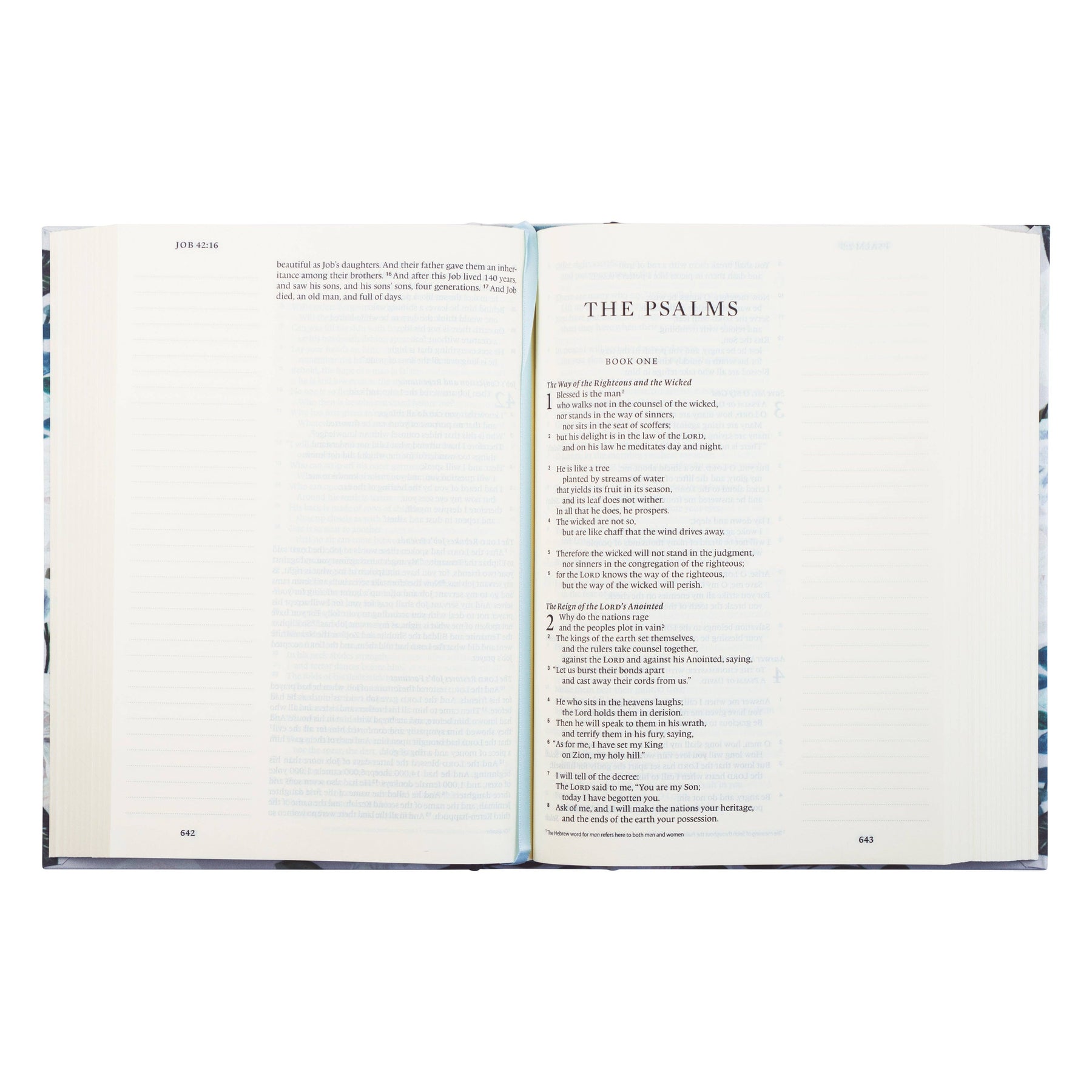 This beautiful large print ESV Single Column Journaling Bible® is named Victoria, inspired by the natural eucalyptus and blooms of Victoria, Australia. We are so excited to offer this beautiful floral Bible for those who prefer larger-printed text with a refreshed design! We chose 1 Corinthians 13:7 to be scripted on the back cover: “Love bears all things, believes all things, hopes all things, and endures all things.” This verse reminds us of the breadth and depth of the love of God—that when truly laid over our lives, we can discover the richness of our faith in him.