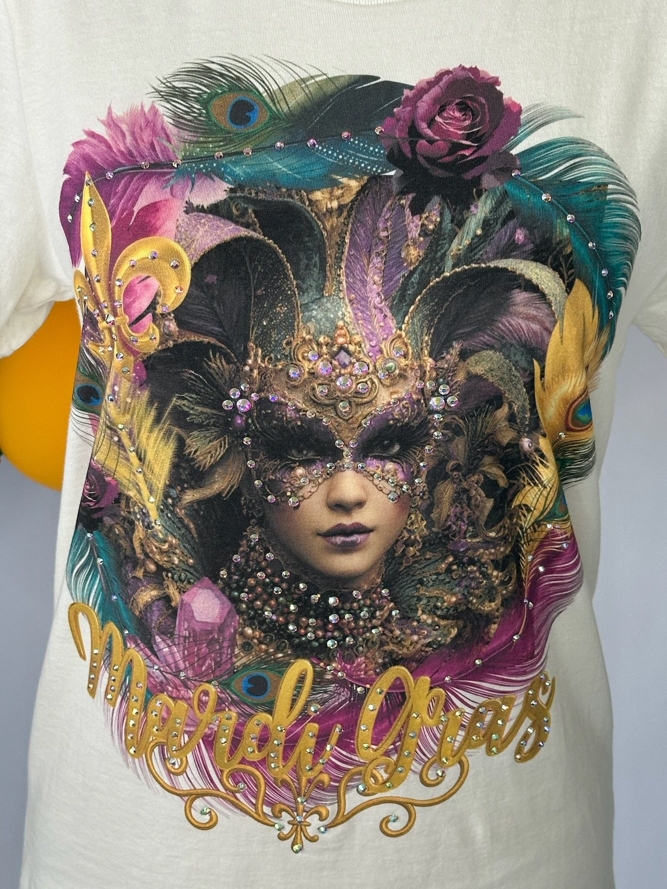 Celebrate the spirit of Mardi Gras in style with this eye-catching masquerade tee. Adorned with shimmering rhinestones and bold embellishments, this blinged-out design captures the glamour and mystery of carnival season. The intricate detailing transforms a classic tee into a statement piece perfect for parties, festivals, or anyone who loves to shine. Comfortable yet striking, it's your ticket to turning heads and embracing the festive energy of New Orleans' most iconic celebration.