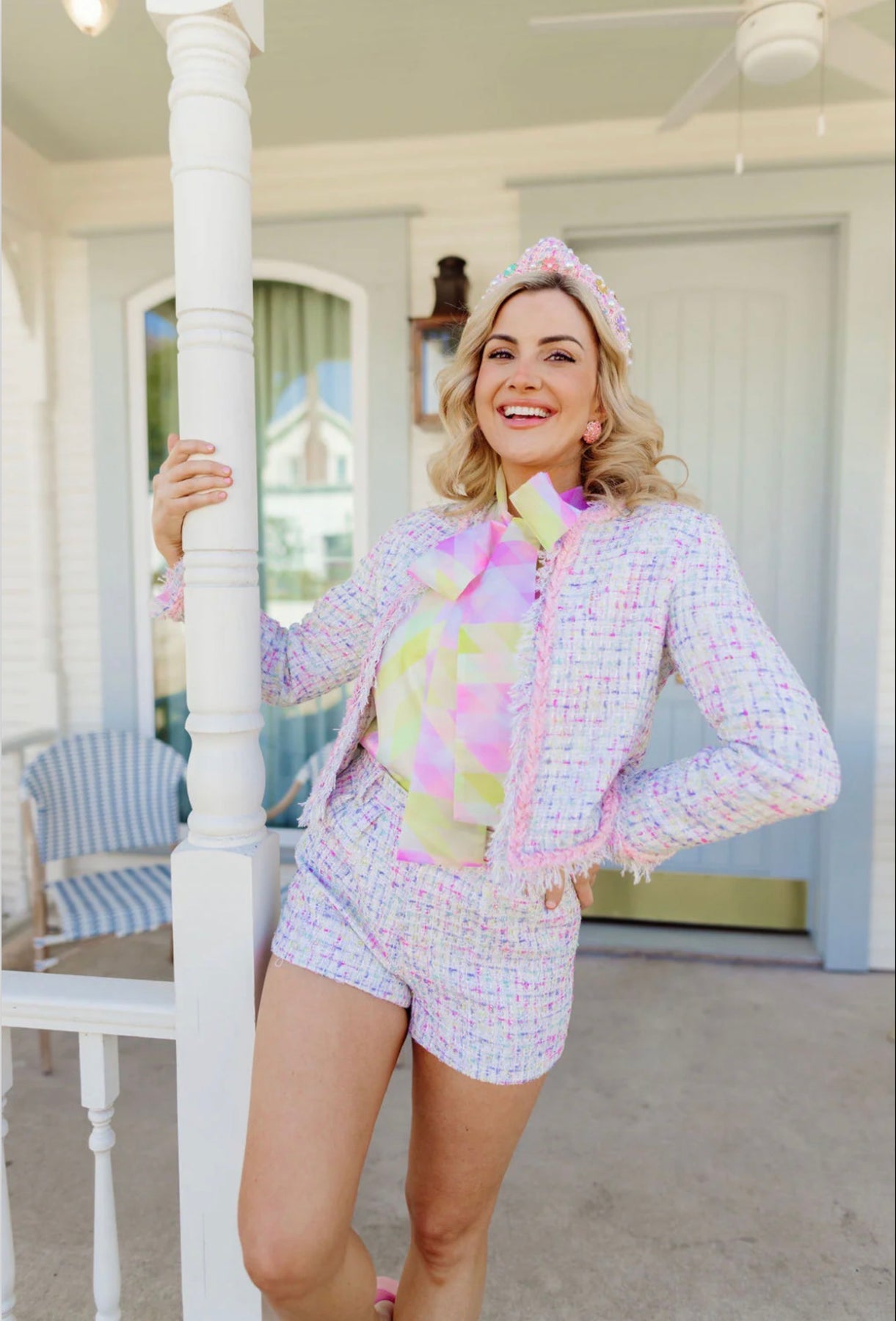 Elevate your spring wardrobe with this stunning white tweed blazer woven with soft, multi-color spring hues. Chic, timeless, and effortlessly classy, it blends luxury craftsmanship with a playful pop of color that feels fresh for the season. The tailored silhouette creates a polished, flattering shape, while the textured bouclé fabric adds that high-end, boutique sophistication your closet deserves. Perfect for brunches, events, or everyday elevated style, this blazer pairs beautifully with denim, trousers, or its coordinating matching bottom — sold separately — for a full luxe set. A statement piece that’s both fun and forever timeless.