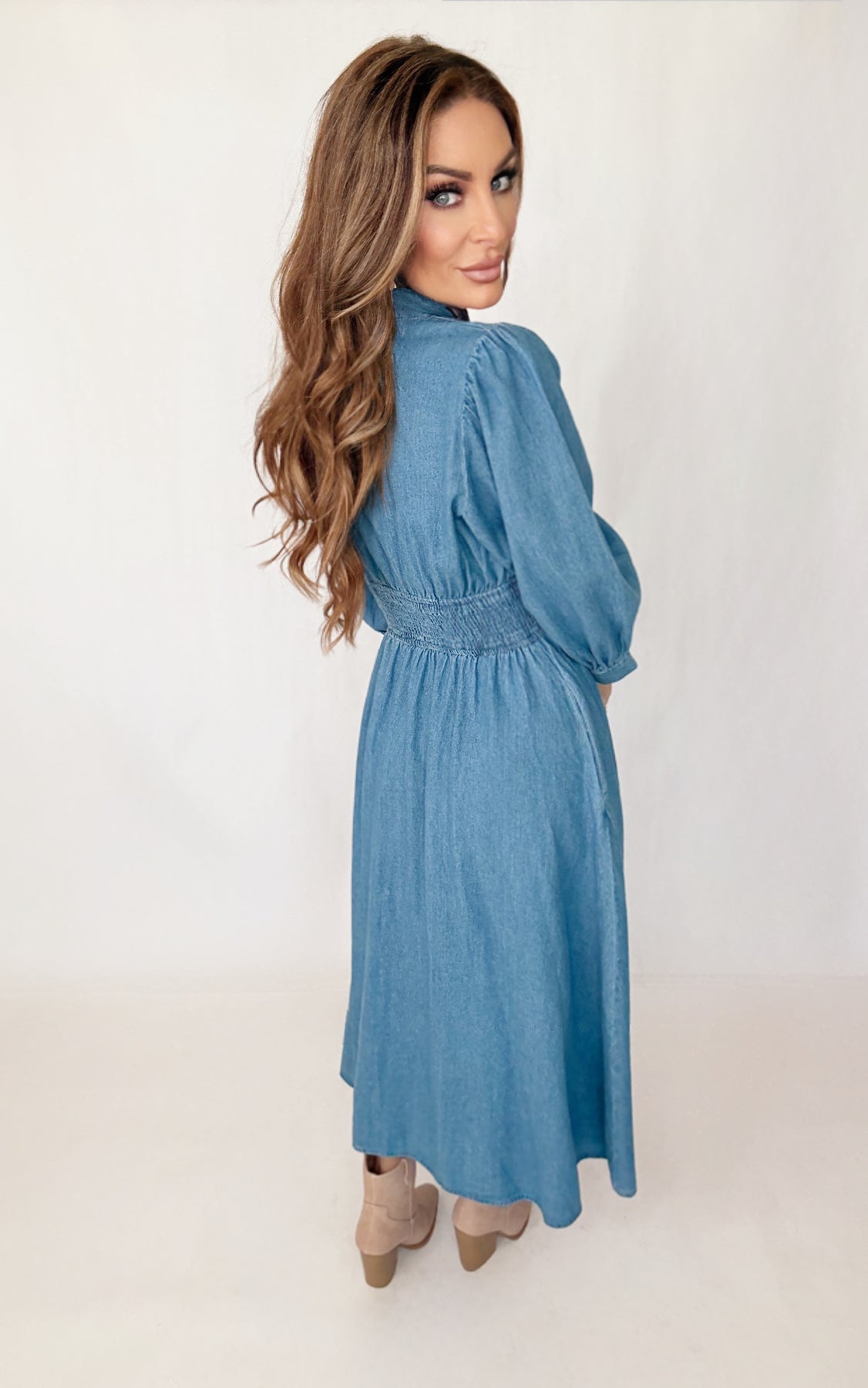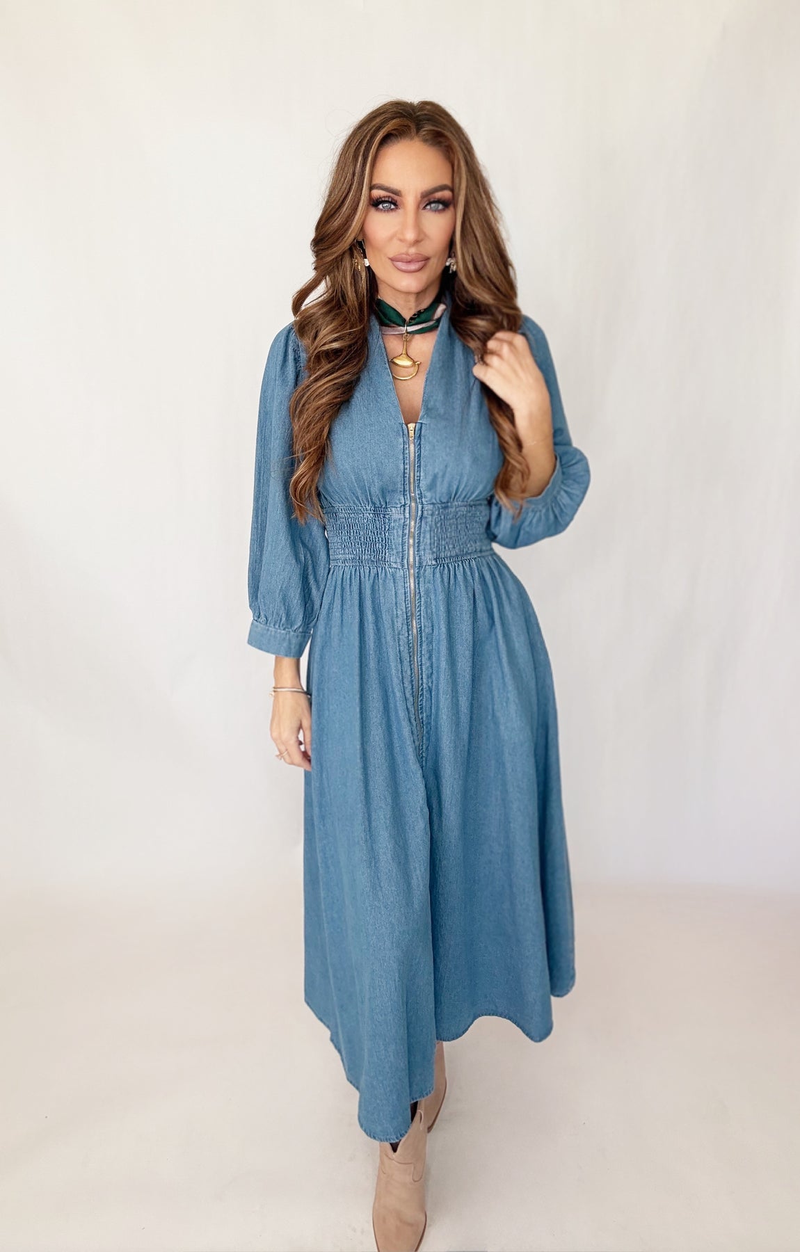 The Blue Kiss Zip Dress combines effortless elegance with modern functionality. This stunning maxi dress features a convenient front zipper for easy on-and-off styling, paired with a flattering cinched waist that defines your silhouette beautifully. Romantic puff sleeves add dimension and charm, creating a look that transitions seamlessly from day to night. Perfect for anyone seeking a versatile piece that balances comfort with sophisticated style, this dress delivers both practicality and undeniable appeal.